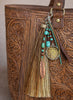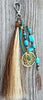 A tassel made from two colors of genuine horsehair is finished with a handwoven horsehair knot. The 'Sacred Hoops' bag tassel features a strand of turquoise, brown and copper beads with a handwoven dream catcher adorning the end. The longer bead strand with turquoise howlite chunks is accented with a 1.5 inch copper colored feather. A 4 inch leather tassel and finish the piece. Measuring 9 inches including sturdy swivel hook.